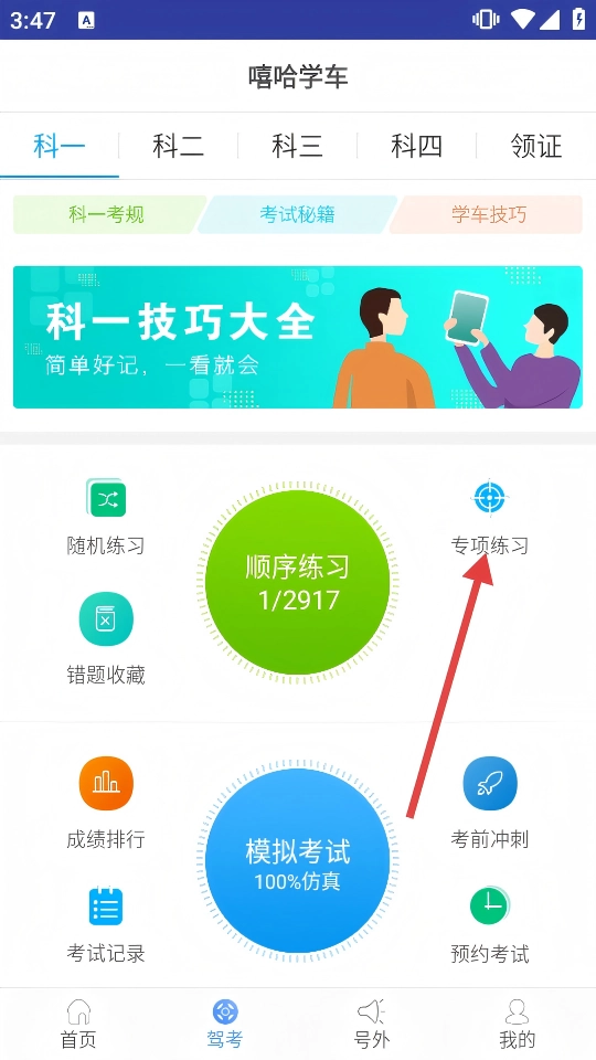 2. 于驾考学习页面,点击【专项练习】按钮,随即能够进入专项练习分类页面。