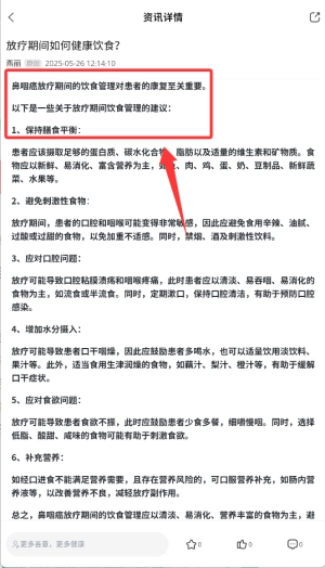 2、通过"健康资讯"栏目搜索关键词,快速查找术后调理、饮食管理等康复知识。
