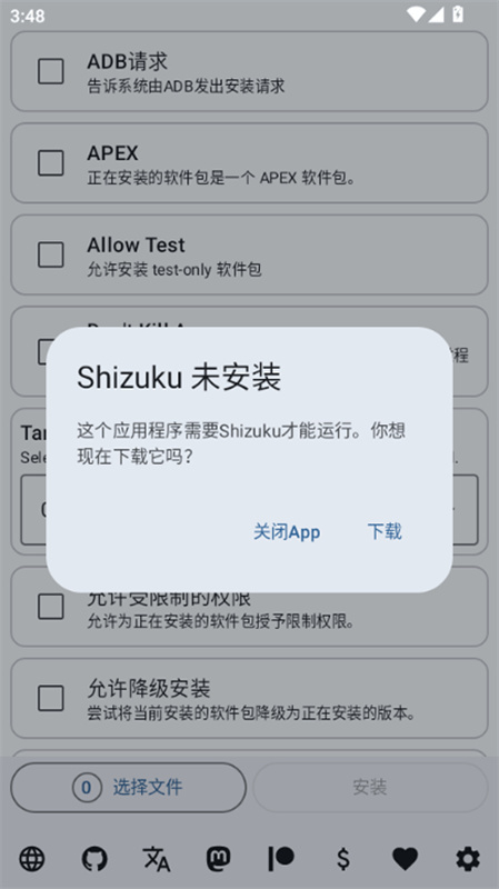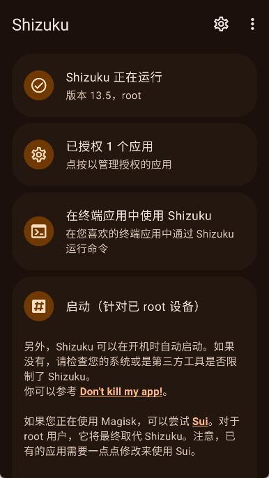 2、若手机未进行root操作,可选择并激活Shizuku工具。