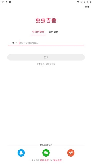 1、接着安装虫虫吉他,初次使用时需进行账号登录,唯有如此才能体验到更多功能。