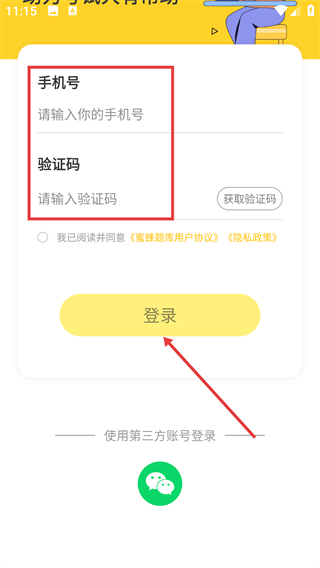 在蜜蜂题库的登录界面输入手机号获取验证码,即可完成登录操作。