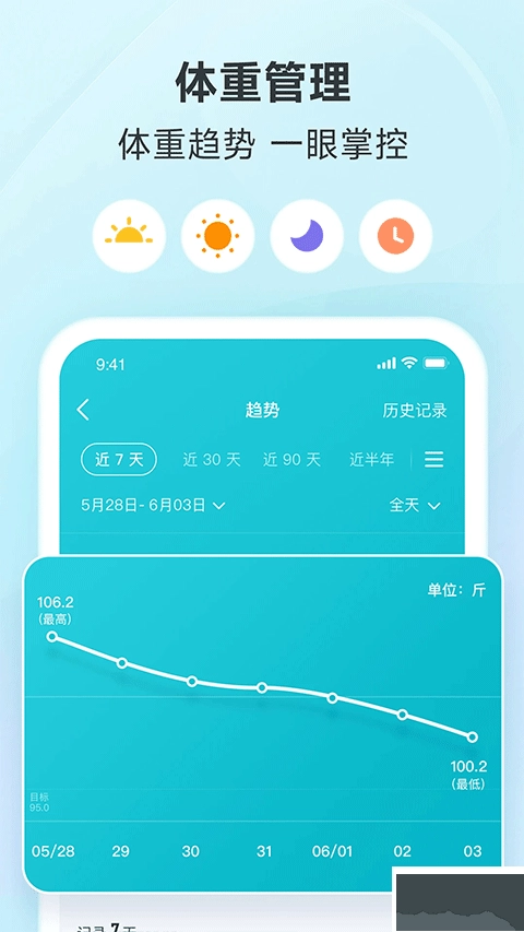 随时查看体重变化趋势、饮食记录以及运动数据,一键就能完成每日健康打卡。
