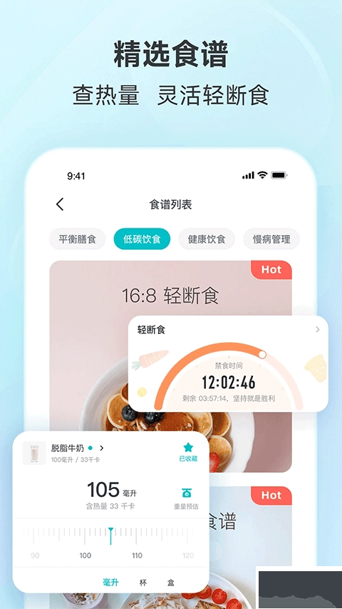 推出丰富多样的间歇性禁食计划,支持自由设定进食时间段,借助智能手段调节代谢节律,进一步提升减重成效。