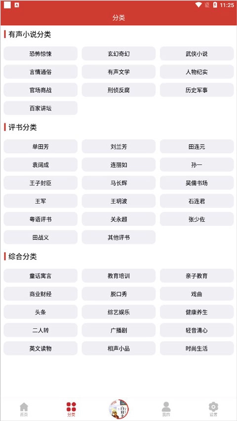 2、借助分类查找:点击底部的“分类”,“评书分类”就会呈现出来,依据个人喜好与需求挑选评书讲解员。