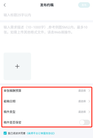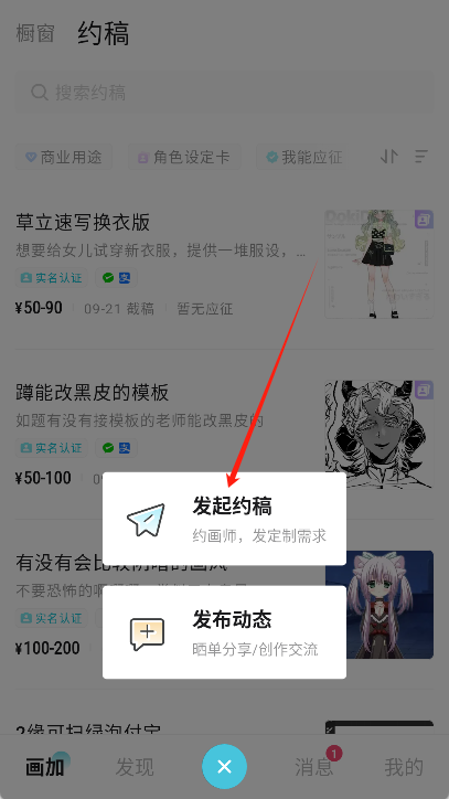画加具备快速约稿功能,发布约稿信息简洁清晰且功能完善。用户能够详细设定稿件的风格类型、规格用途等要求。针对约稿新手,一键约稿功能可帮助其快速预约喜欢的画师。