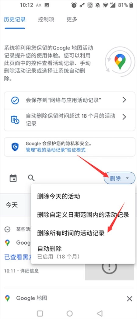 4、最后进入历史记录功能栏,点击“删除”,接着选择想要删除搜索记录的时间及指定条目,就能轻松删除搜索历史啦!