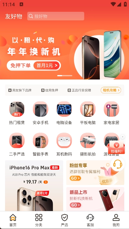 友好物,作为用友集团成员企业、友金所控股子公司倾力打造的互联网智能硬件免押租赁创新平台,秉持“以租代购、先享后付、共享共赢”这一信用消费全新理念,致力于服务年轻化、热爱时尚与科技的优质用户群体,助力用户削减新产品的使用成本。平台具备信用免押、确保正品行货等特性,让用户在租赁过程中倍感安心。不仅如此,平台丰富的品类以及实时上新的产品,充分满足了不同用户的租赁需求。在此,推荐有相关需求的用户前来使用。