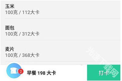 3、选择一餐开始记录后,用户可自行选择摄入食物的重量或数量,软件会自动将其换算为卡路里数据,添加完成后点击右下角的打卡按钮即可