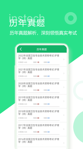 初级护师题库是成都英时科技有限公司专门为初级护士考试学习打造的刷题备考工具。用户既能挑选练习题进行作答、查看答案以快速掌握知识,也可以直接浏览历年真题并选择练习,从而更清晰地熟悉题型。此外,题库还提供详尽的试题解析,帮助用户及时了解每道题涉及的知识点,弥补自身知识短板。