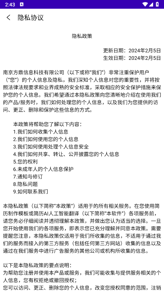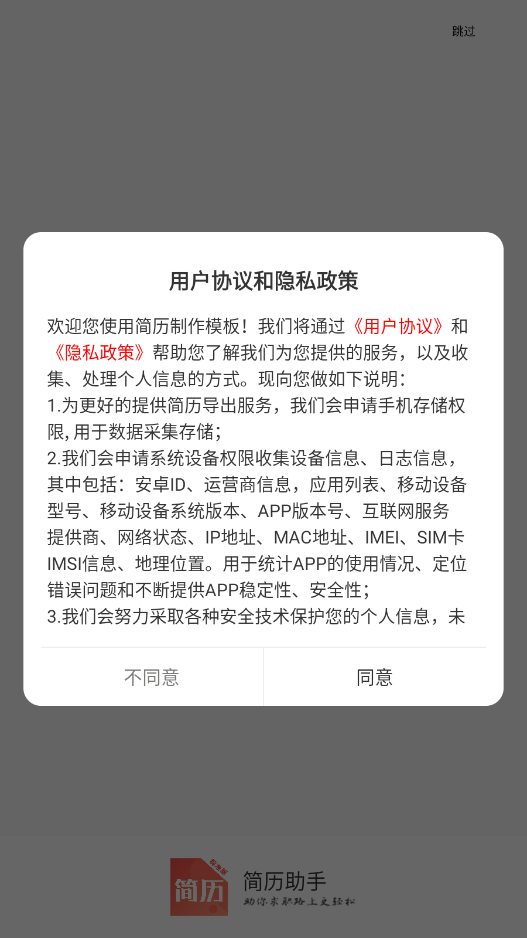1、安装简历制作模板,在同意相关政策与协议后进入使用。
