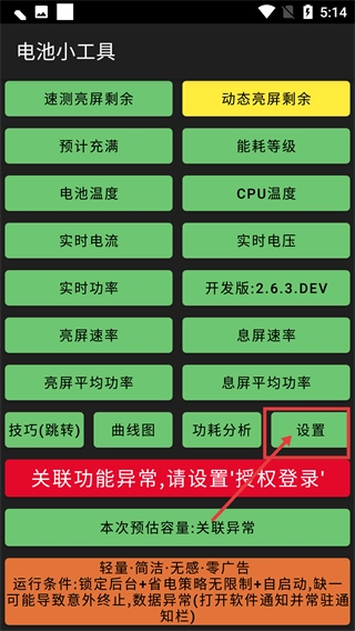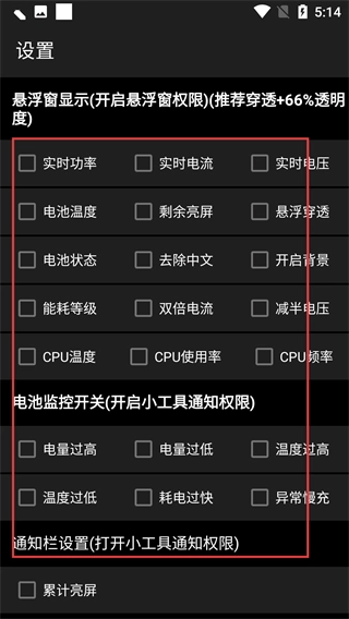 1、进入设置界面后,首先处理【悬浮窗显示-开启悬浮窗权限】这一项,可根据需要勾选【实时功率】【实时电流】等选项,以此完成电池监控开关相关权限的配置。