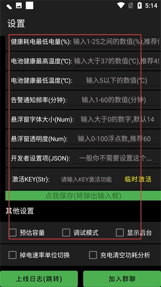 在设置界面中,你可以对【健康电池最低电压-(%)】【电池健康最高温度-(℃)】这类参数进行设置,还能调整【悬浮窗字体大小-(Num)】。