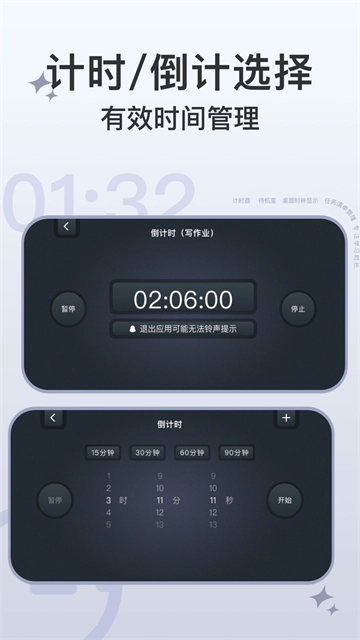 2、计时器与倒计时功能支持一键切换,可满足您多样化的时间管理需求