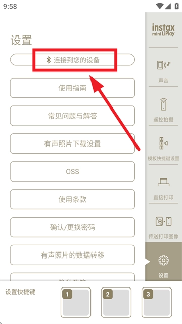 关于instax mini LiPlay,能够对相机侧面那三个快捷按钮对应的模板进行设置。