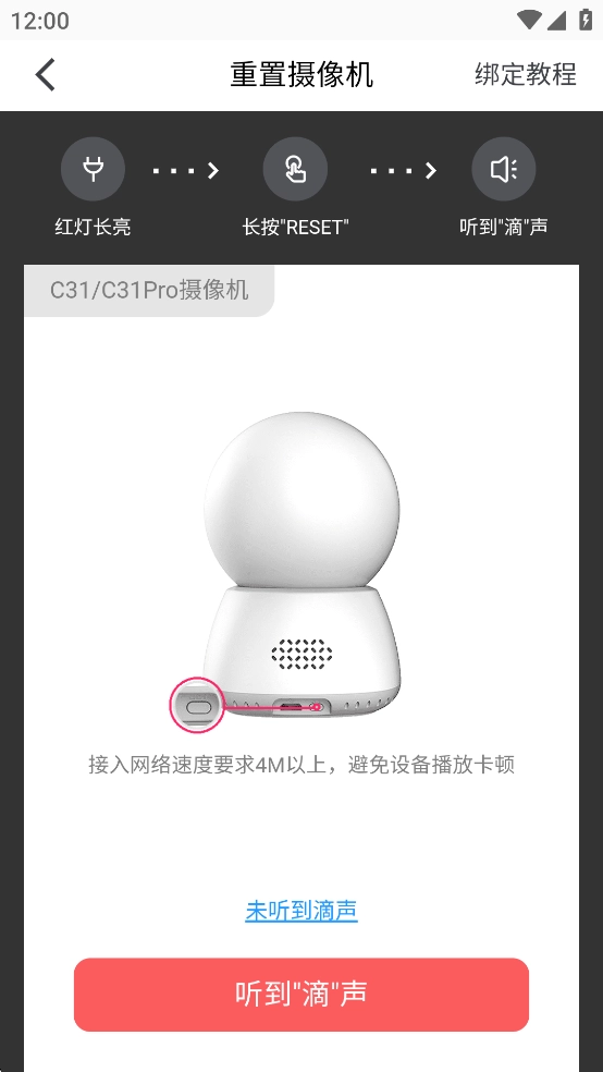 3、按住摄像头背面的“RESET”设置按钮约1至2秒,听到“滴”的一声后松开按键,此时红色LED灯会开始闪烁,说明摄像头正处于待配置状态,请点击“下一步”按钮;