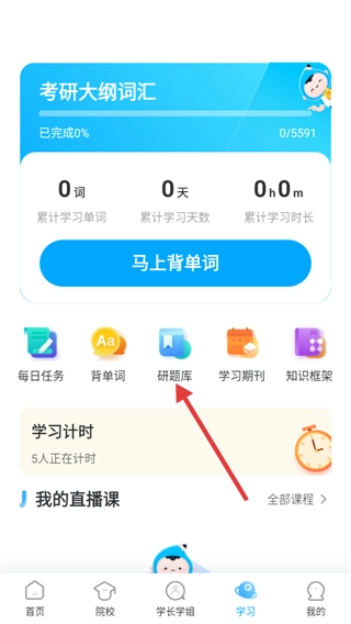 1、在学习页面,点击【研题库】选项,就能进入科目选择界面。