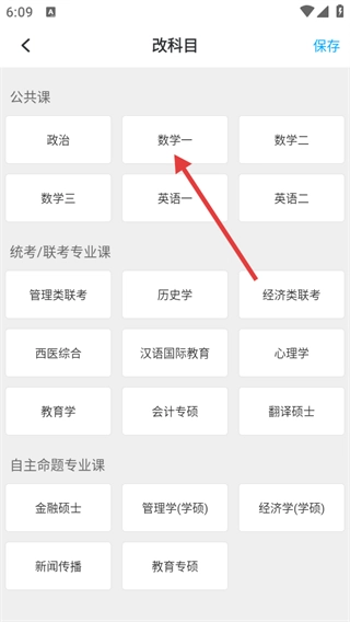 2、进入科目修改界面后,选择【数学一】这类具体科目并点击【保存】按钮,就能进入该科目对应的题库页面。