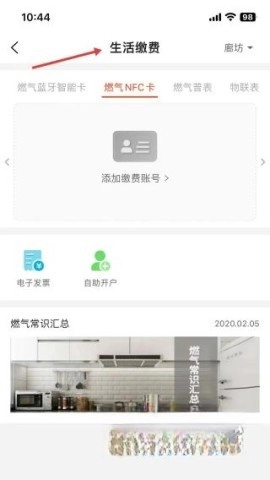 1、第一步,打开生活缴费页面。在此页面,你不仅能够便捷地通过NFC卡缴费,还能添加账号。此外,电子发票与自助开户等功能也应有尽有,要是想体验一下这些功能,完全没问题!