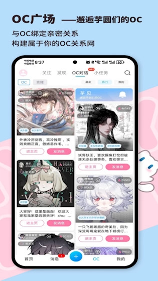1、OC角色创建:可自定义角色形象、性格、背景故事等信息,打造专属原创角色并发布到社区。