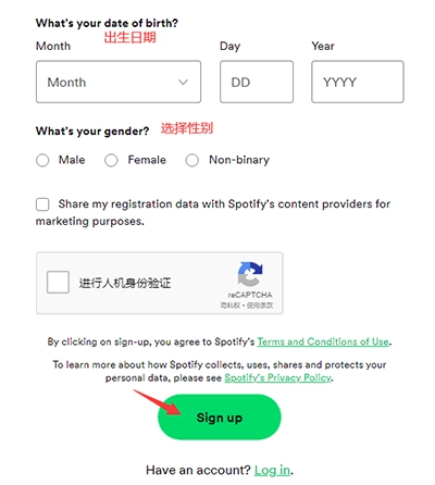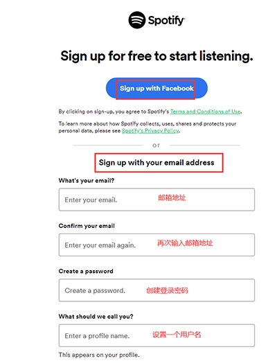 若你选择通过电子邮箱进行注册,就需填写用于注册的邮箱账号,并创建spotify密码。之后,依照要求填写个人信息,其中涵盖昵称、生日、性别等。