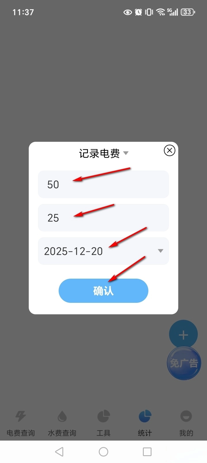 输入用量、价格和时间,点击【确认】