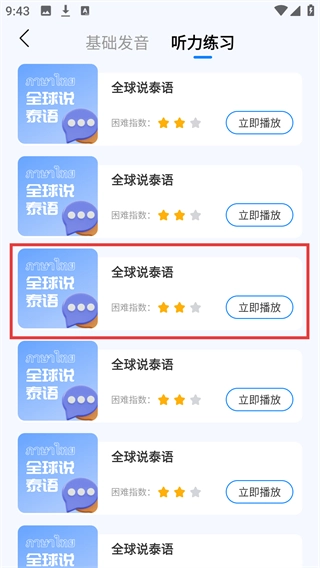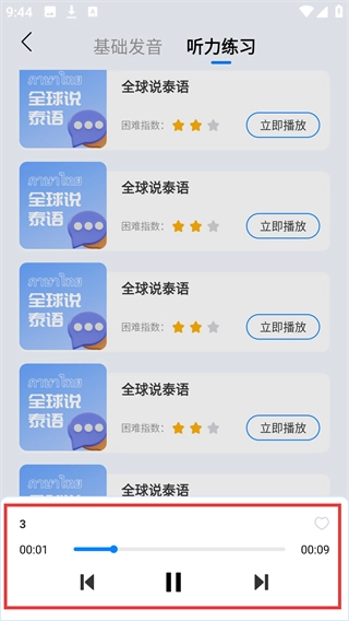 3、在【听力练习】标签页中,选择目标内容如【全球说泰语】,点击对应的【立即播放】按钮开始学习。