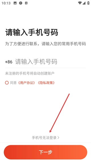 1、在该页面输入常用手机号码,勾选协议后点击【下一步】,未注册号码会自动创建账户。若遇问题可点击【手机号无法登录】。