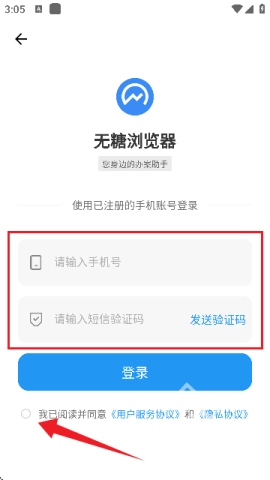 1、安装无糖浏览器后将其打开,首次使用该浏览器时,需要同意用户协议和隐私政策。