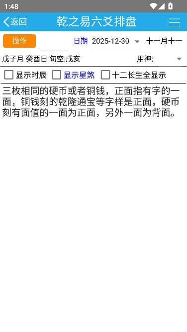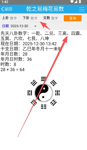 2、点击输入上卦、下卦的数字,选定爻数与日期后,即可启动梅花易排盘操作。