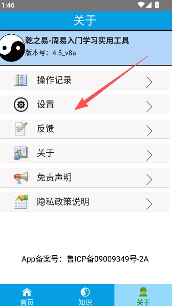 1、在软件的关于界面中,点击设置选项。