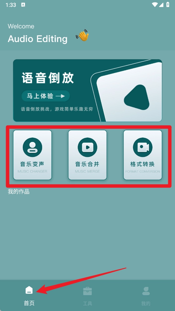 3、首页提供音乐变声、音乐合并与格式转换功能选项,能够满足用户多样化的音频处理需求。