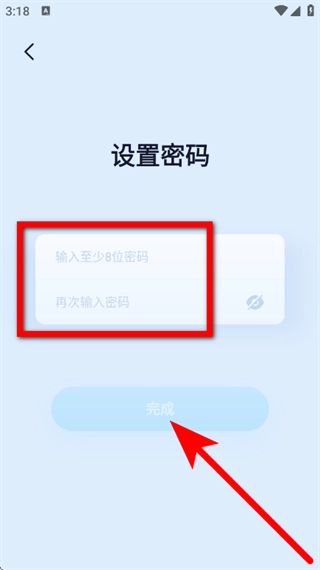 4、进入设置密码页面后,输入要设置的密码,点击“完成”按钮,即可完成账号注册流程。