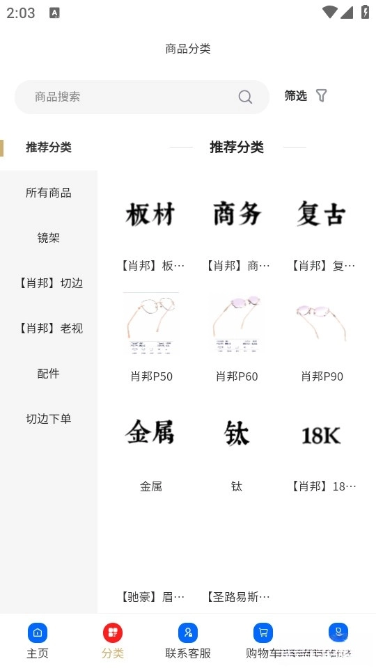 1、商品分类清晰:眼镜商品细分为镜架、切边、老视镜等类别,便于按需查找具体型号与规格。