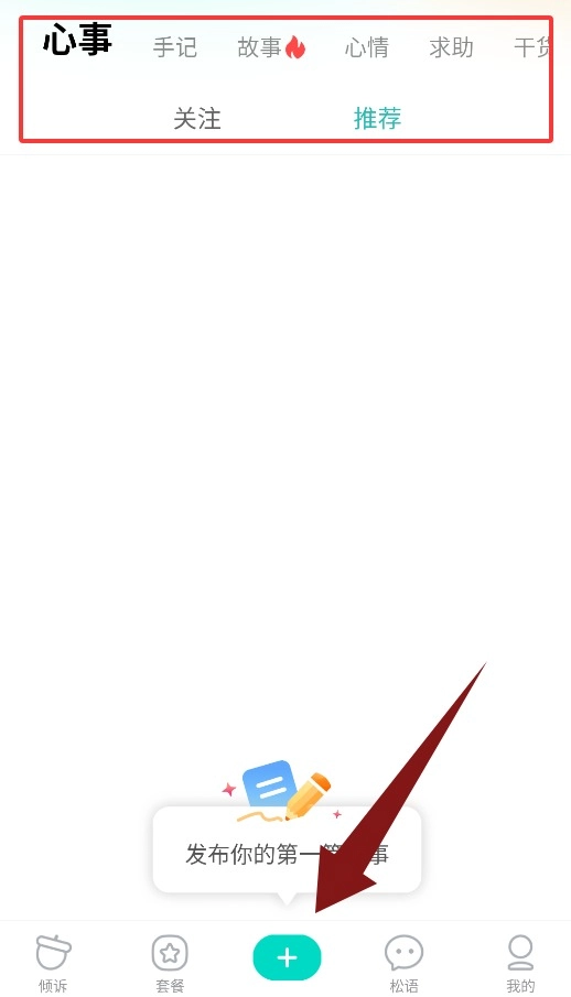 3、心事界面可浏览心事、故事、心情与求助等关注推荐内容。
