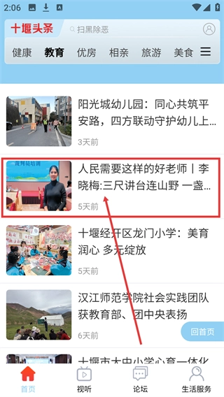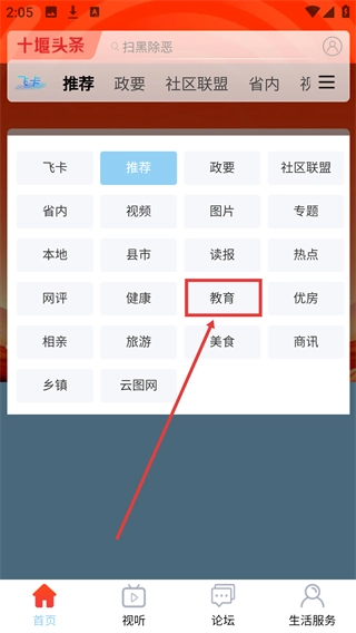 2、在分类列表中,找到【教育】分类并点击,可进入教育类内容的资讯列表页面。