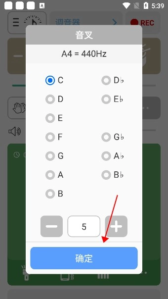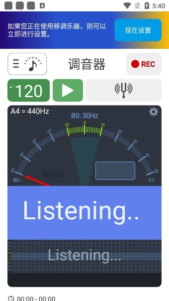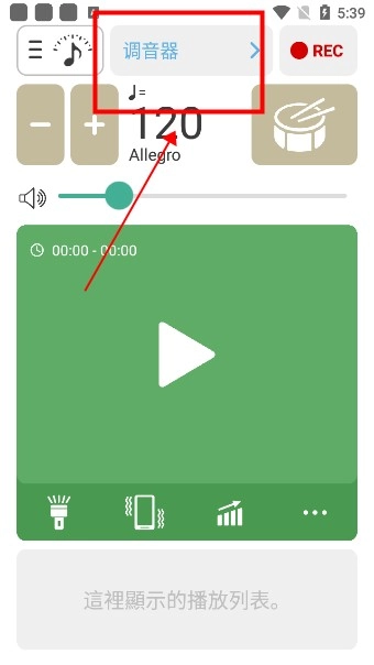 1. 软件打开后呈现的是节拍器,点击页面上方“调音器”这三个字,即可进入调音器。