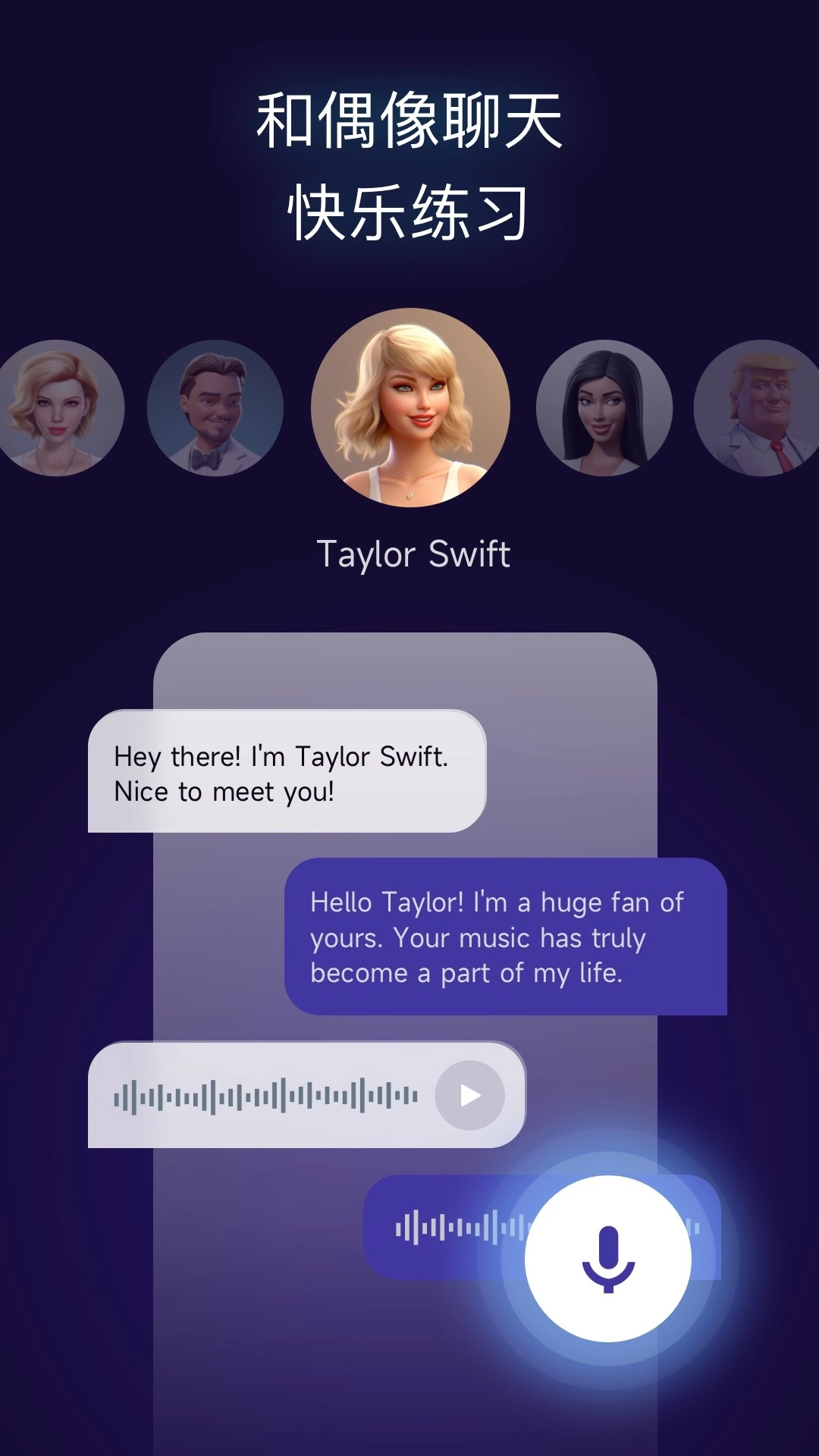 • 名人对话:与AI模拟的考官、名人对话,提升口语表达的自信与流畅度。