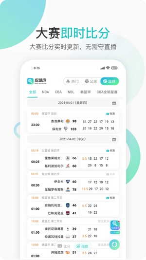 3.即时比分:实时更新全球各类赛事实时数据,让用户随时掌握比赛动态。