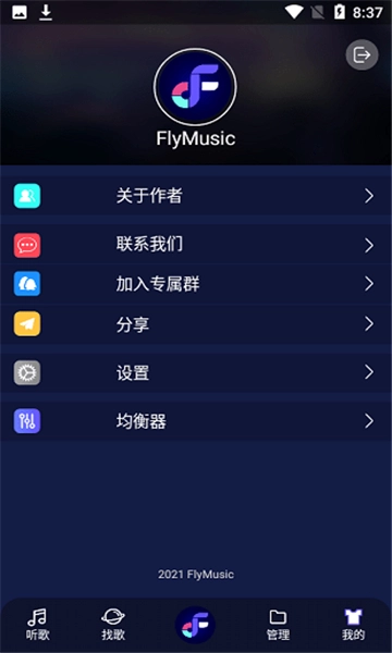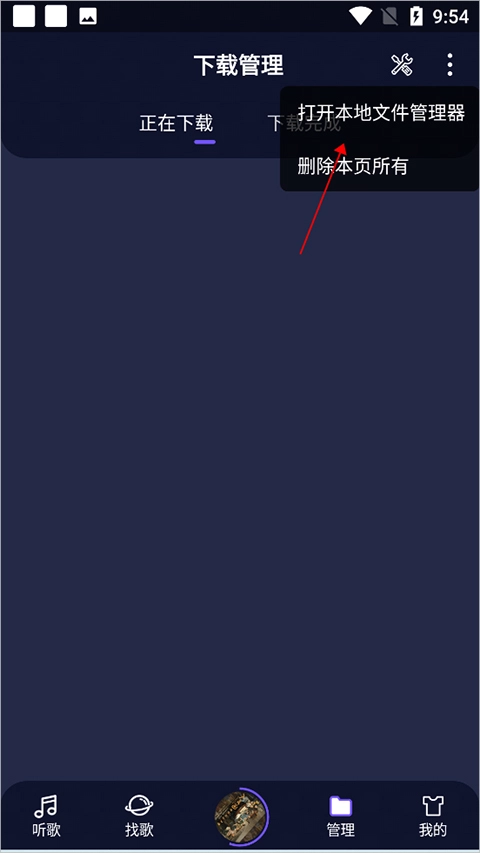 用户进入fly音乐【管理】页面中,点击右上角的扩展菜单图标(下图红色箭头所指)