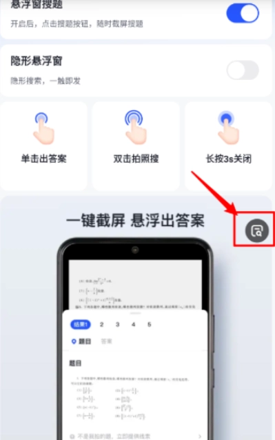 4、接着打开悬浮窗搜题的开关,开启浮窗权限后就能打开浮窗,享受高效的答案搜索服务了。