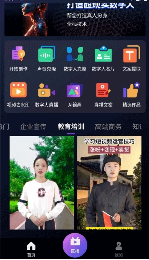 1、进入首页后选择数字人模板,可依据应用场景进行挑选,比如教育培训领域