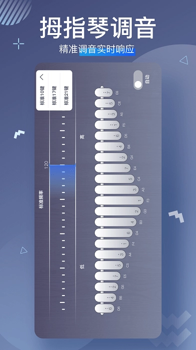 拇指琴调音器安卓版是一款为拇指琴量身打造的实用工具,可快速检测琴键音准问题并提供调音指导。借助清晰界面与智能识别功能,新手也能轻松学会调音技巧。该软件支持10键和17键这两种常见规格,还具备自动音高显示、手动调音模式以及专业音准修正建议等多种实用功能,助力用户提升演奏水平。此外,这里还有丰富的教学资源和琴谱可供参考,让调音过程变得简单高效。感兴趣的话就来体验吧。