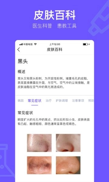 1、皮肤疾病百科全书,收录由权威医生撰写的科普内容,并配备可视化的患教工具;