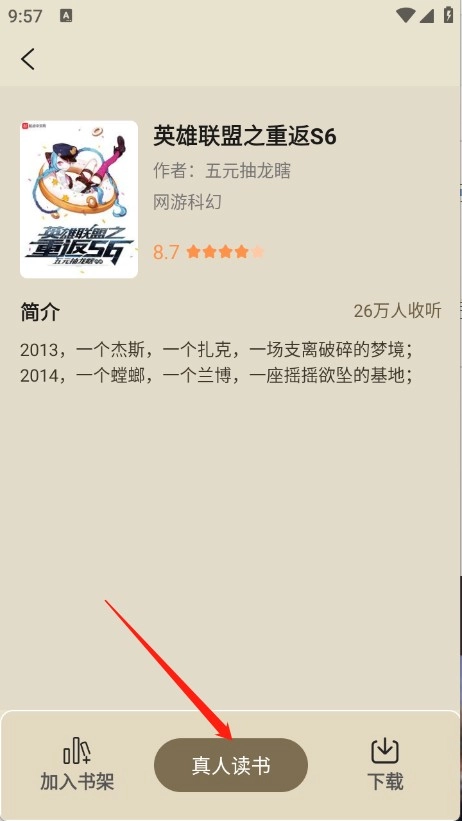 4、用户点击想要聆听的小说,进入详情页面后,再点击“真人读书”选项。