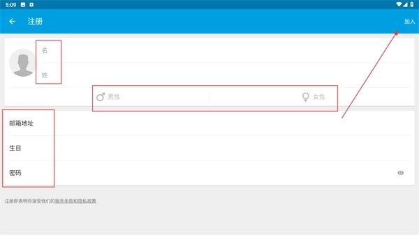2、在注册页面依次填写【名-姓】,选择【性别】,补充【邮箱地址-生日-密码】信息后,点击页面右上角的【加入】按钮即可完成注册流程。