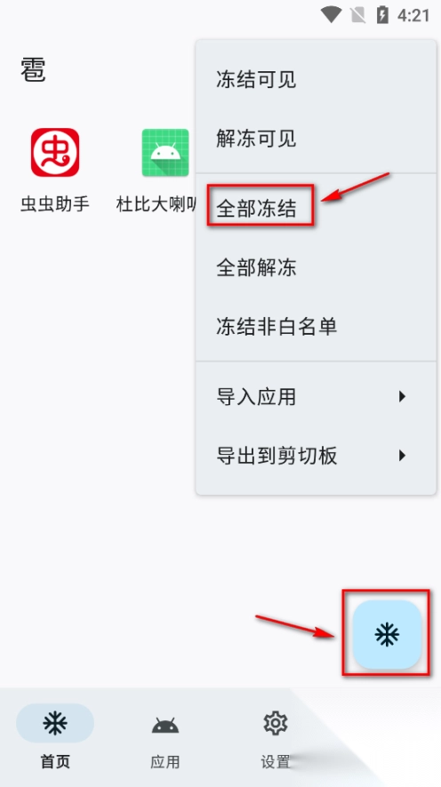 返回首页可以看到冻结应用已选择好