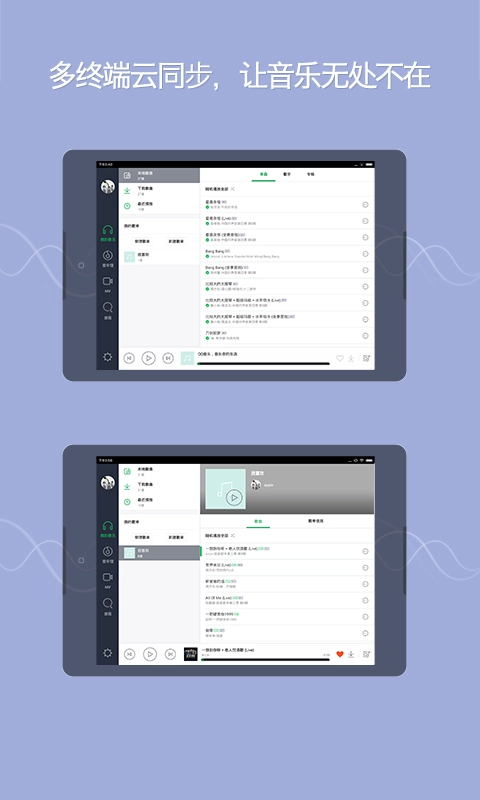 无论是在沙发上惬意放松,还是在地铁中通勤赶路,多终端多平台的产品支持,让您能以最舒适的姿势,随时聆听喜爱的歌曲,让音乐融入您的生活。