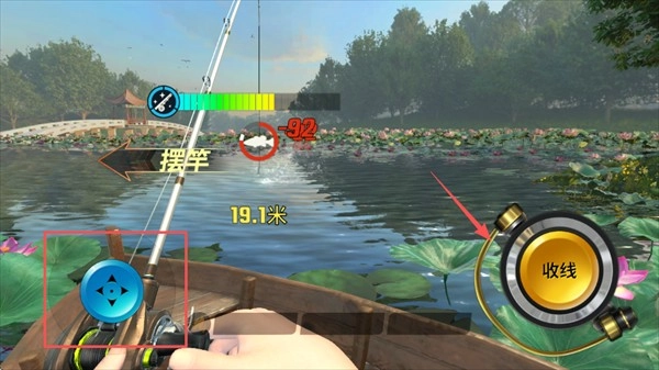 4、长按收线按钮来消耗鱼的体力,这鱼的力气可真不小,等提示出现的时候,得像这样摆动鱼竿!