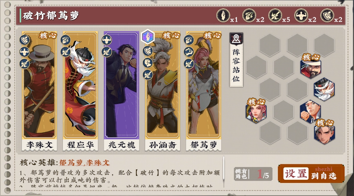 3、打法思路:郁茑萝的普通攻击属于多段攻击,搭配【破竹】效果中每次攻击附加额外伤害的特性,能够造成高额输出。这套阵容前排角色数量不少,但整体坦度欠佳,因此比较依赖李殊文的大招来争取更多时间。