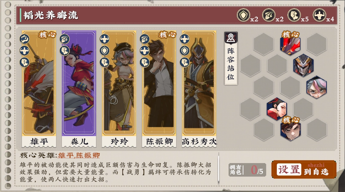 3、打法思路:雄平的被动技能能够让他在造成高额伤害的同时恢复大量生命值。陈振卿的大招效果十分强力,不过释放需要消耗大量能量。而【战勇】这个羁绊可以把承受的伤害转化为能量,帮助这两人更快地释放出大招。